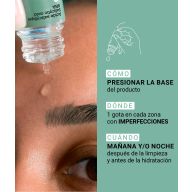 Apretar la base del frasco y aplicar la siguiente cantidad directamente sobre la piel del rostro: - 1 gota en brotes aislados, - o 2 gotas para cada zona afectada (frente, nariz). También puede aplicarse localmente en otras zonas del cuerpo afectadas (espalda, escote, etc.).
